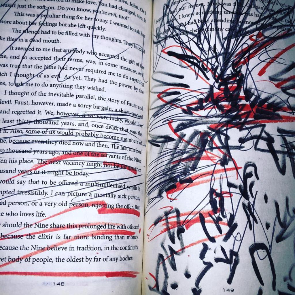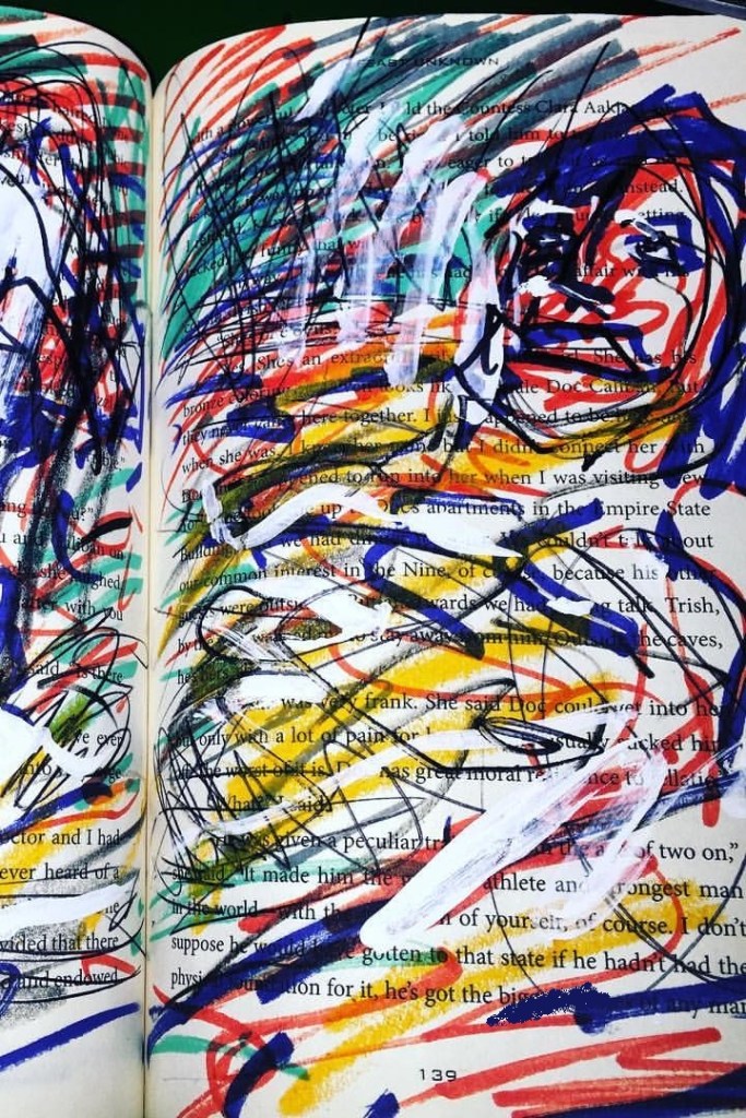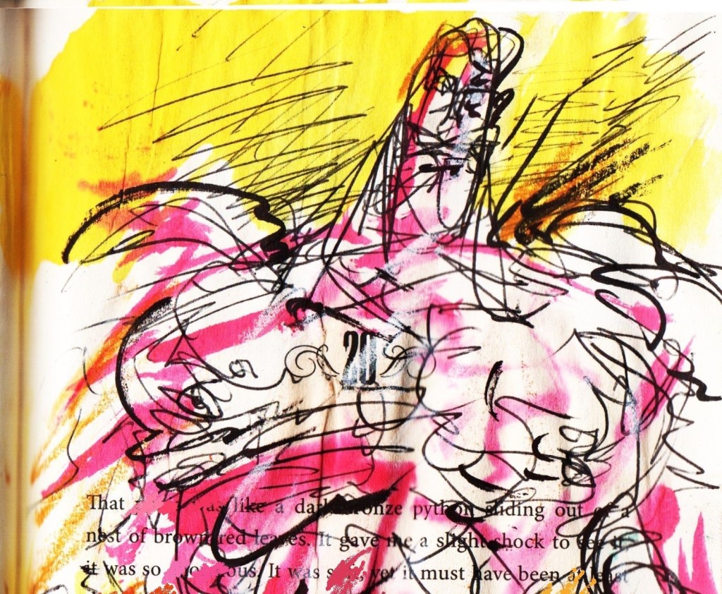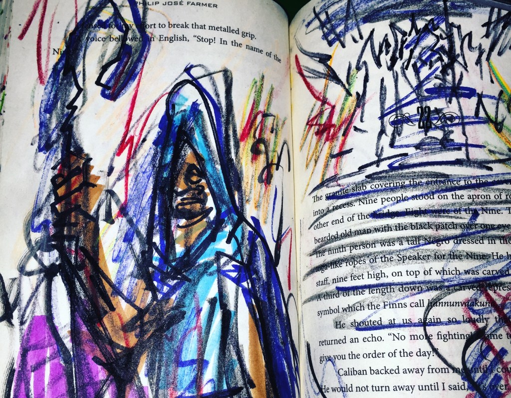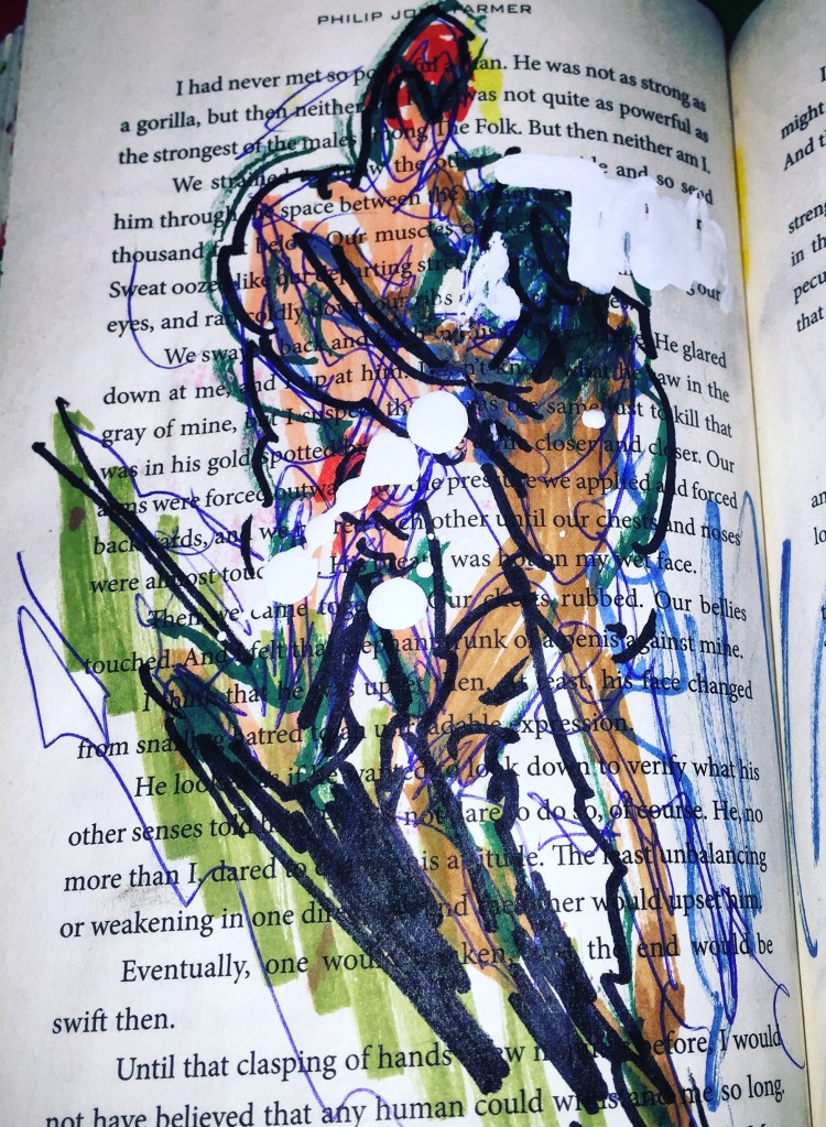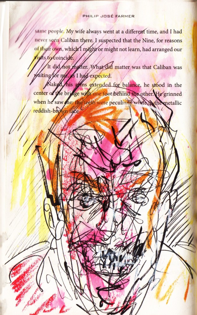 In this month’s earlier blog post, Painting Into Books: The Creation of Readable Art, there are dynamic visual samples of Iason Ragnar Bellerophon’s method of painting directly onto the pages of books. That technique did not begin with the painted books of the Talos Saga. Years before undertaking that epic project, Iason was drawing onto the pages of his personal copies of Philip José Farmer’s adult pulp classic A Feast Unknown. Character sketches, scene depictions…they are hints of the visionary magnum opus that was to come, and are mesmerizing in their own right. Farmer’s pastiches of Doc Savage and Tarzan, Caliban and Grandrith, literally burst off the pages.