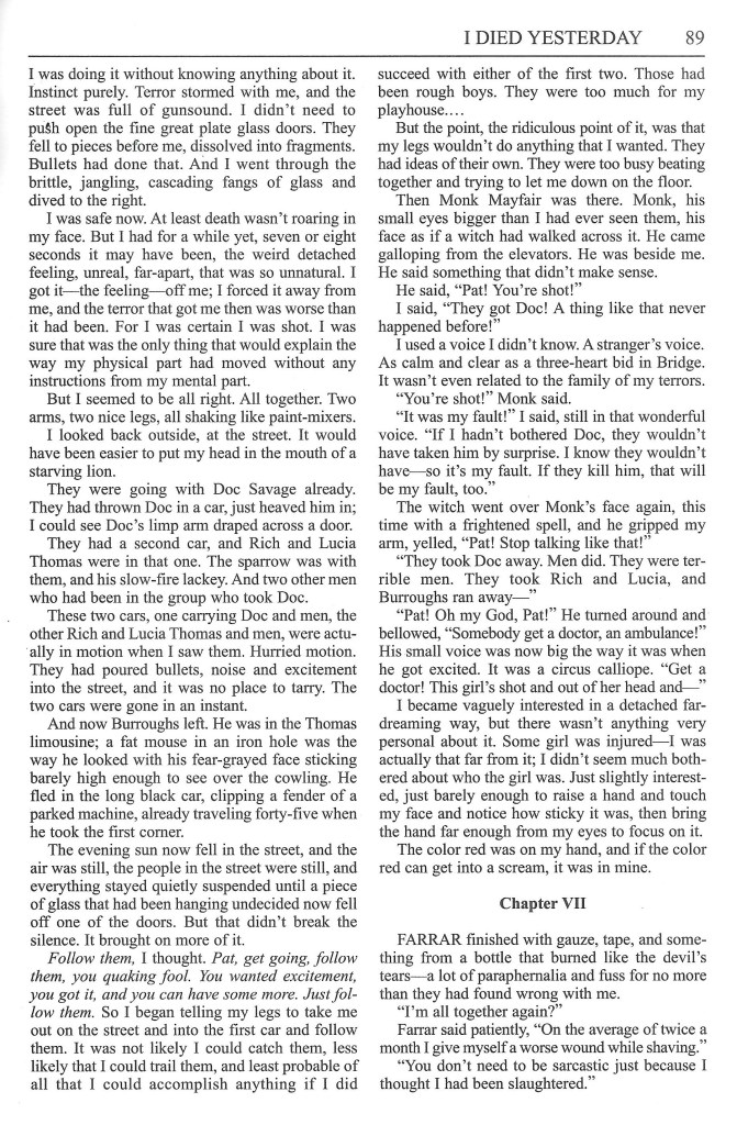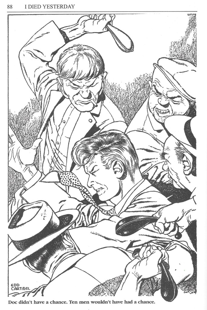 Soon Doc is also attacked, and the scene at the end of Chapter 6 of I Died Yesterday is, to my mind, one of the most intense and compelling I have ever read from the pen of Lester Dent, including the unforgettable line: