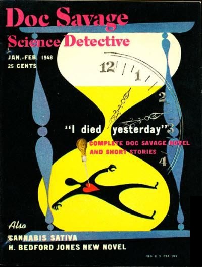 Jarring as they are to someone who visualized a Doc Savage magazine in the light of a Walter Baumhofer or James Bama, they were not just a mad editorial whim…book and magazine covers in postwar America had undergone a great change since the debut of Doc Savage magazine in 1933. Penguin Books in the 1940’s launched a successful line (sometimes new novels, sometimes re-packaging old ones) that used similar abstract techniques, pioneered by artist Robert Jonas.
