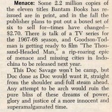 The film of course was never made. Goodson-Todman discovered that they did not have the film rights after all…Conde Nast owned only the book publication rights. Lester Dent has retained control of any film to be done using Doc, and those rights had passed to his wife Norma after his death. She was apparently not averse to doing a deal, but instead the project was dropped (I can imagine the chaos between movie execs, Conde Nast execs, lawyers for both sides…)