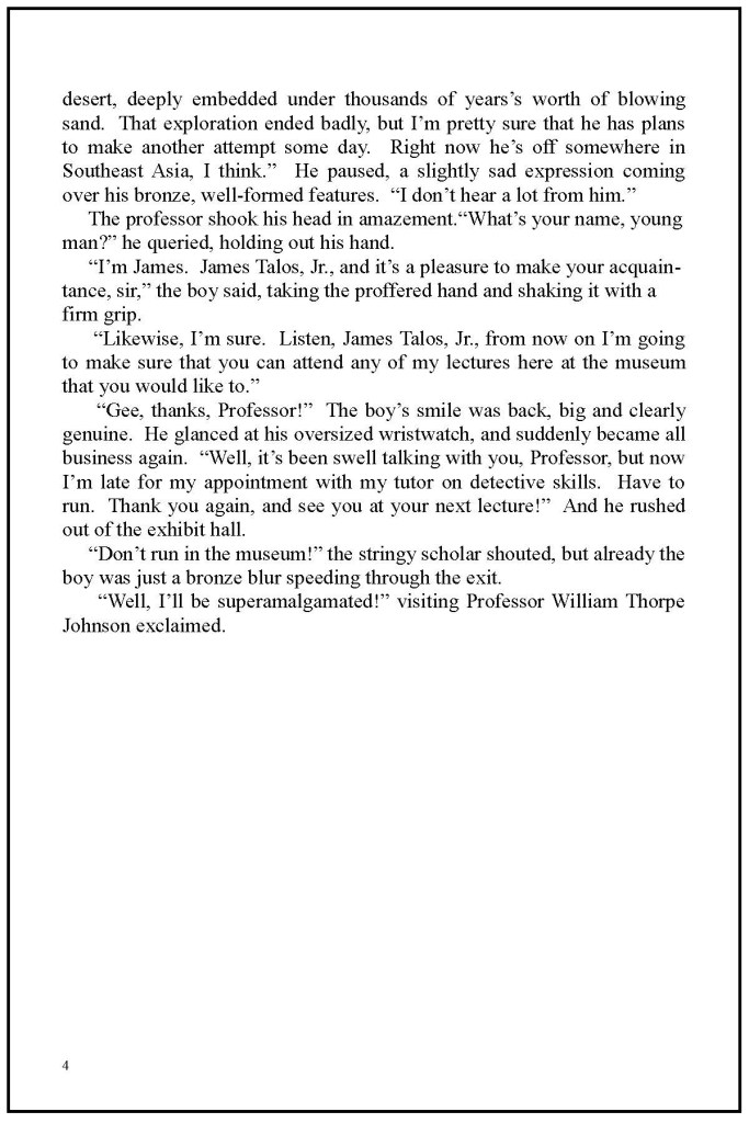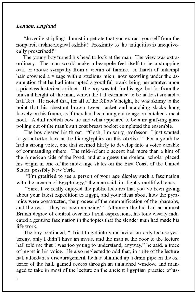 Note from Doc Talos author/contest judge R. Paul Sardanas: Daryl Morrissey, creator of the huge Refractions in Bronze project, displays his virtuosity in the world of a renowned 20th century adventurer, as well as his fascination for the untold stories from the youth of the man who would come to be known as Doc. In this tale, we are given the delightful experience of the first meeting between a particularly bright young man and an erudite professor with a voracious penchant for (to use uncharacteristically small descriptives)…big words.