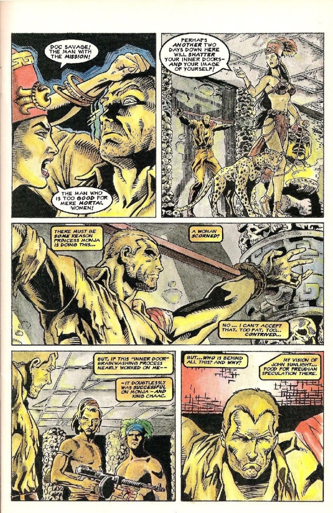 A little later, we see Monja and her father, Chaac. She has restored her hard demeanor, but is shaken for a moment upon discovering Doc is still alive…then her anger clamps down again. Doc, learning that John Sunlight had preceded him to the Valley of the Vanished, believes Monja has been hypnotized. Author Mark Ellis, to his credit, does not take this easy narrative route, and instead deepens the psychological complexity of her rage.