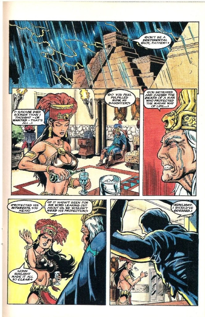 He is promptly attacked, and after getting the upper hand against the Mayans who have ambushed him…it is revealed that the person orchestrating that assault is actually Monja. It is a memorable last panel to the first issue of the four issue series, with a breathtaking (and intensely angry) Monja standing over a fallen Doc.