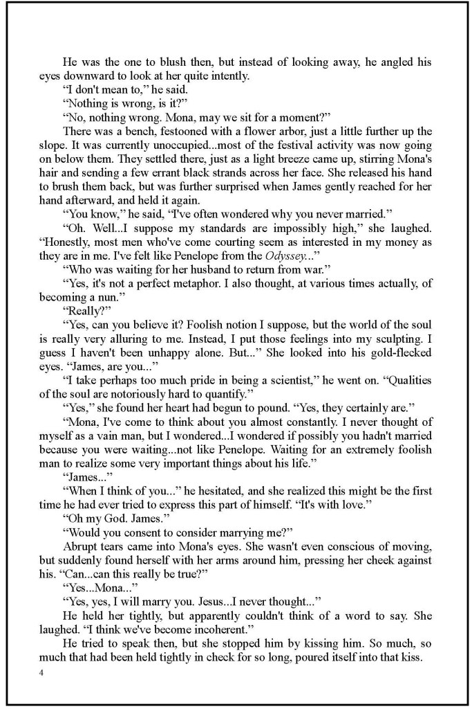 Comment from author Marissa Sarno: I was always the girl who ignored plot. It didn’t matter if I was reading a thriller, a classic, a science fiction opus or an adventure yarn. I wanted to know about the characters, to read digressions into their lives, to have the author give me moments where I feel like I knew them as if they were real people. So though I was fascinated by the gloriously complex dynamics of the Talos Saga, I really just wanted to write a nice moment for those noble-but-unhappy lovers, Doc and Mona. A moment when love feels magical. Because everybody, everywhere, even fictional characters, should have at least one moment like that in their lives.