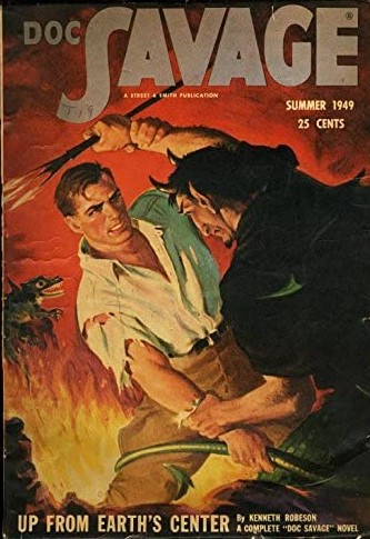 As the last issue in the pulp run of Doc Savage magazine, its publication heralding the end of the hero pulps in 1949, the story Up From Earth’s Center has achieved something of mythic status. On the surface, its themes are worthy of that status — after 16 years of epic storytelling, the inference was that Doc Savage would take his fight against evil to Hell itself. The cover literally depicts Doc grappling with Satan.
