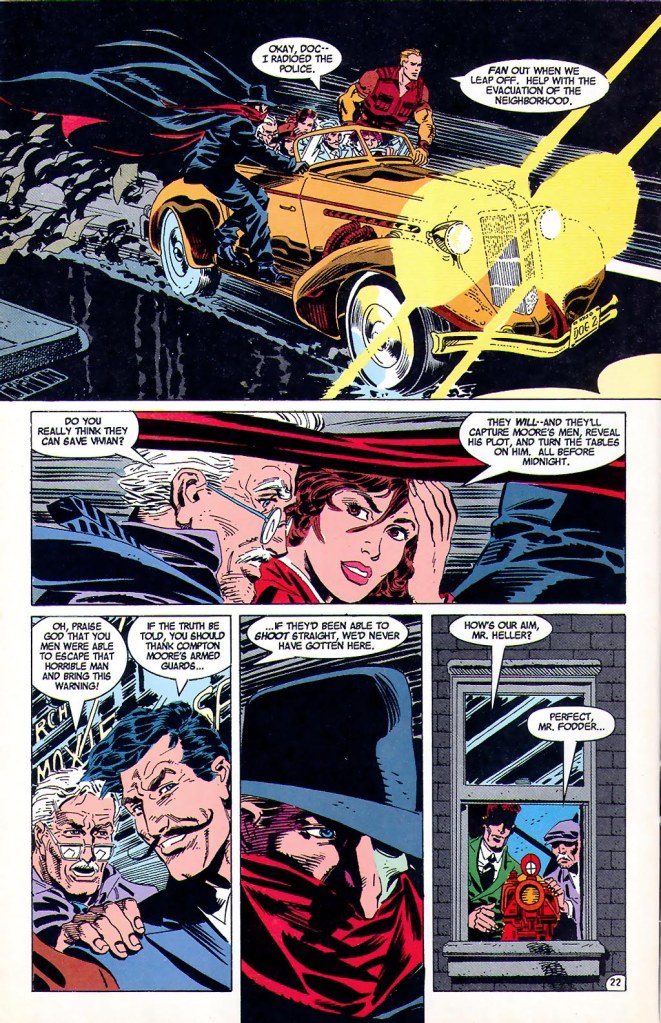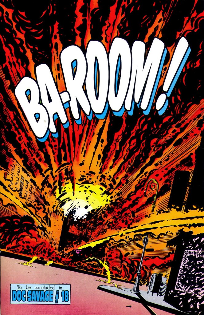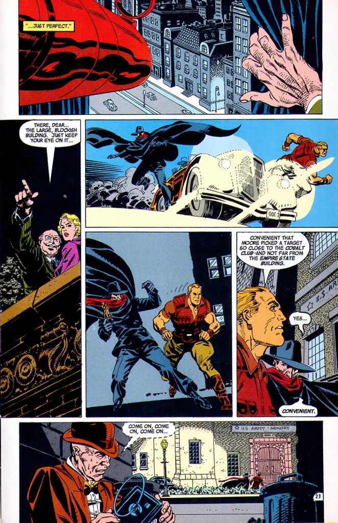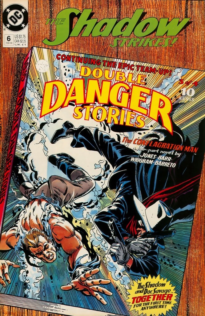 Part 1 and Part 2 of this article explored the unique novelty of seeing Doc Savage and The Shadow together in the 1990 DC Comics story The Conflagration Man. There were a number of clever, fun moments of mixing the story and character structures of the two great pulp heroes. Authors Mike Barr and Gerard Jones (who as solo writers guided each of the two comics for DC), had a unique arrangement in telling the story: they plotted the overall tale together, then each scripted his own book as they alternated…Barr for Doc Savage, Jones for The Shadow Strikes. It was an interesting partnership, which in some ways mirrored what might have been had Lester Dent and Walter Gibson ever joined forces on a story. Barr (like Dent) tended to favor action scenes and a headlong pace of adventure, whereas Jones brought a more tightly-plotted and subtle approach to the writing that more resembled Gibson’s writing style.