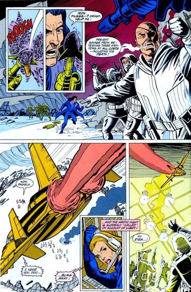 Very soon Sunlight enlists the aid of a rogue terrorist nation (which somewhat mimics Iraq) to get him launched via rocket to a space station where once again a play on his name provides a plot device…he plans to use one of Doc’s “doomsday inventions” to block all sunlight from reaching the Earth. With this as his leverage, he unveils his wish to unite the entire planet in a kind of managed utopia.