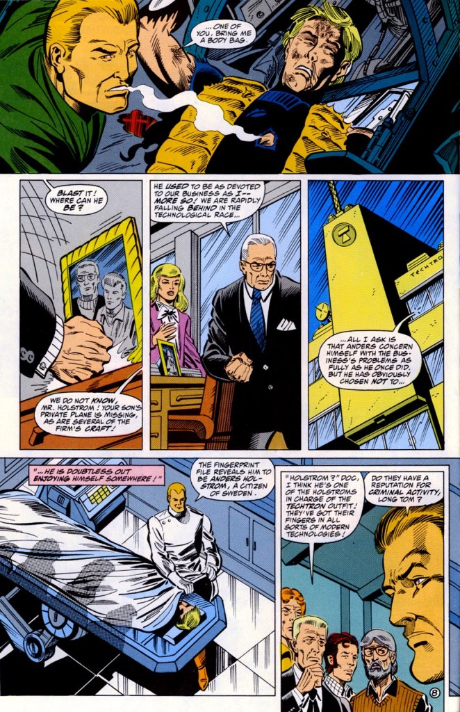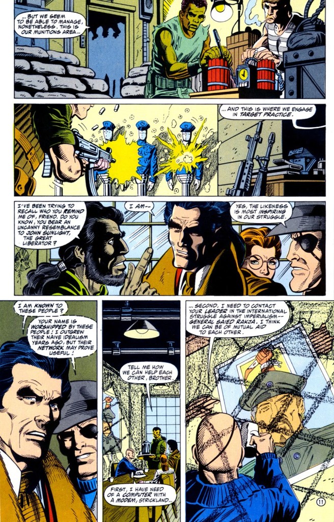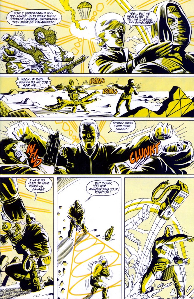 Sunlight and his minions escape with the weapons using a skyhook to airlift them away. In the midst of the escape, the chief mercenary attempts to persuade Sunlight to abandon the woman scientist who had accompanied them, but he refuses — an interesting development, as he will show a growing attachment to the woman as the story progresses.