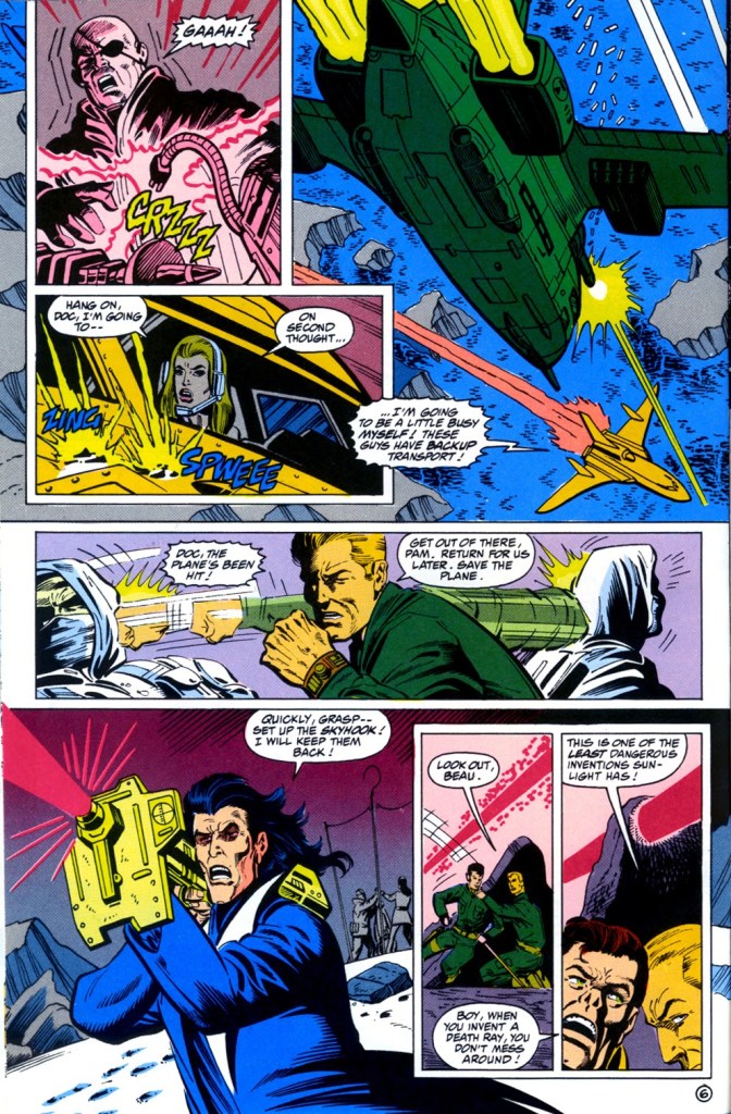 When we left off, Sunlight and Doc had faced off at the site of his now-abandoned pulp-era Fortress of Solitude. In the original pulp story that introduced Sunlight, he had stolen horrific weapons that Doc had cached there (ironically, to keep them away from malevolent characters like Sunlight). Having recovered the weapons, Sunlight was using them against Doc and his aides.