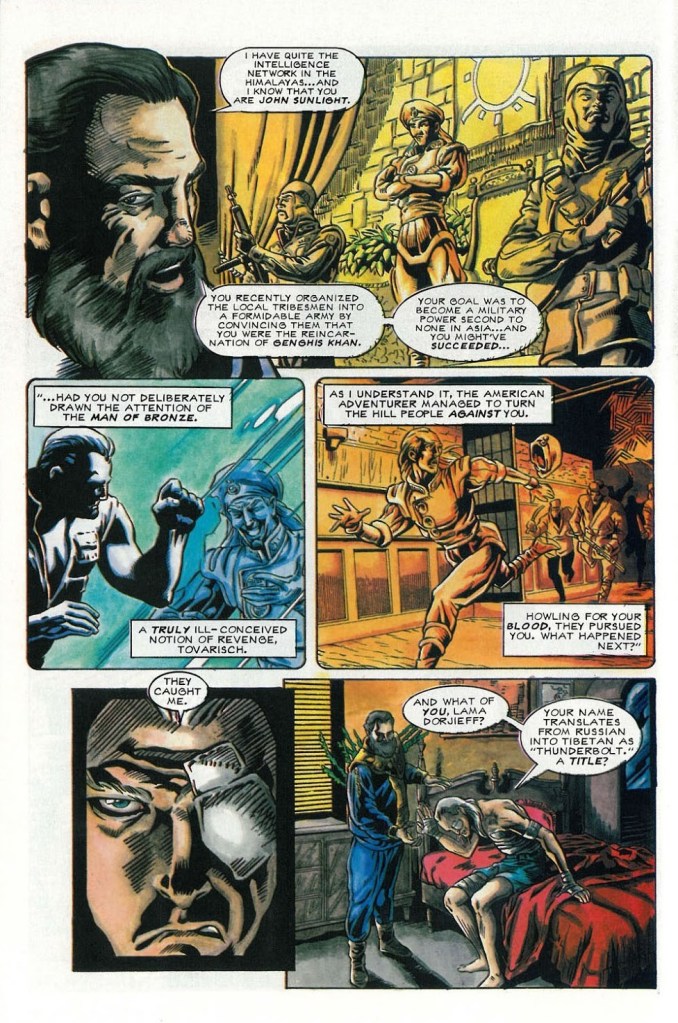 In the first parts of this article, I explored the pulp magazine roots of the villain John Sunlight in the 1930’s novels Fortress of Solitude and The Devil Genghis, followed by his comic book incarnations, which began fifty years later. Marvel Comics, in the 1970’s, teased a story featuring Sunlight in their black and white Doc Savage Magazine, but the series was cancelled before that story was done. It was in the late 1980’s that DC Comics revived John Sunlight, in a four-part story arc entitled Sunlight Rising. That story was largely adept, faithful to its pulp origins, and highly entertaining. But the best was yet to come.