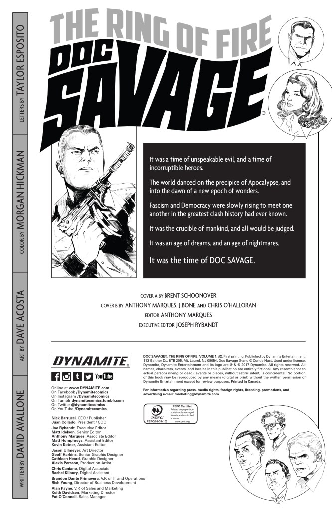 The most recent appearance of John Sunlight in a mainstream venue was in the 2017 Dynamite Entertainment comic book limited series Doc Savage: The Ring of Fire. The author of this story is David Avallone, and the interior art is by Dave Acosta. This is also the last time (to date) that a Doc Savage authorized comic book story has been done by any company. I’m glad to say that if it is a finale (at least for now), it’s a good one.