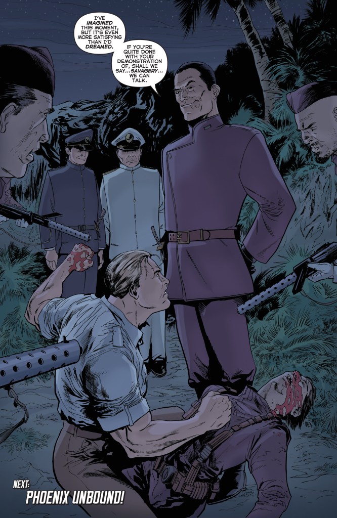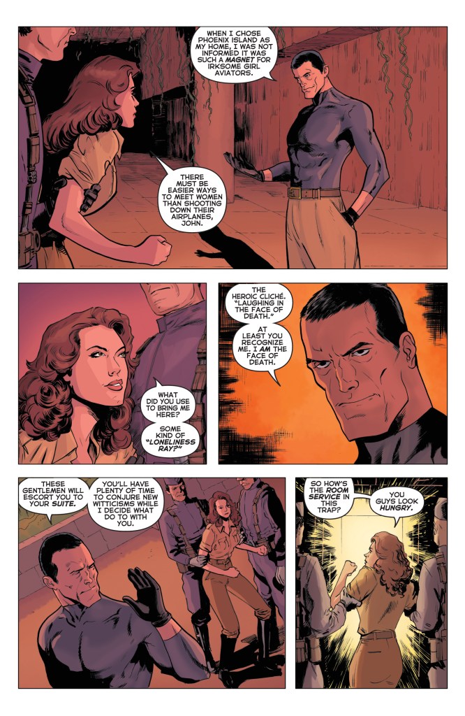 Meanwhile, Pat and Amelia have escaped their cell, and (true to form for Pat) are raising some havoc as they attempt to reach one of the planes at Sunlight’s compound. Sunlight, having tea with the Japanese officers, does not seem particularly concerned.