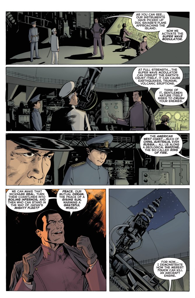 In this Chapter, Doc finally makes his “sound.” In the original pulps, when Doc is deep in thought, he unconsciously emits a strange trilling sound. His men are used to it, but I’m sure Admiral Leahy has never heard anything like it. I didn’t want to use it gratuitously, just for fan service… but this is the moment where Doc really connects all the dots and figures out his course of action. In the art for this issue, Dave Acosta references both INDIANA JONES AND THE LAST CRUSADE and THE SIMPSONS. But here we are… three issues in, and Doc’s shirt STILL hasn’t been ripped. One issue left, Doc.