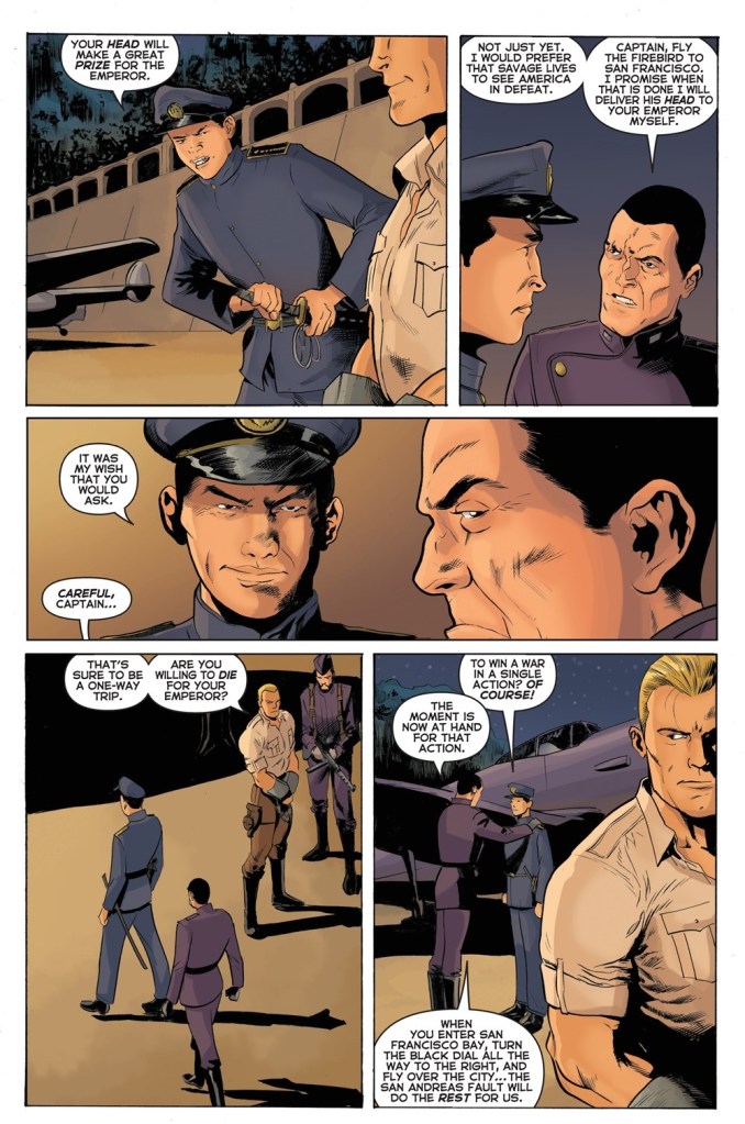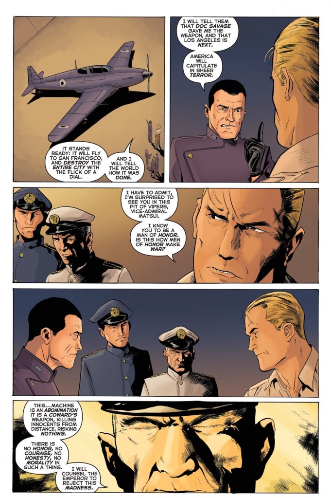 Chapter Four: Already? I could have written twelve issues of this story. In 1938, there was considerable tension within the Japanese military and I wanted Matsui and Osato to represent both sides of that debate. History demonstrates, tragically, who won that argument in the long run. Matsui’s list of objections to the Ring of Fire/Superwave Modulator are based on the principles of the Bushido Code. Matsui is ticking off all the ways in which the weapon breaks those rules. Of course, so does the atomic bomb. Now we finally rip Doc’s shirt. Is everybody happy now?