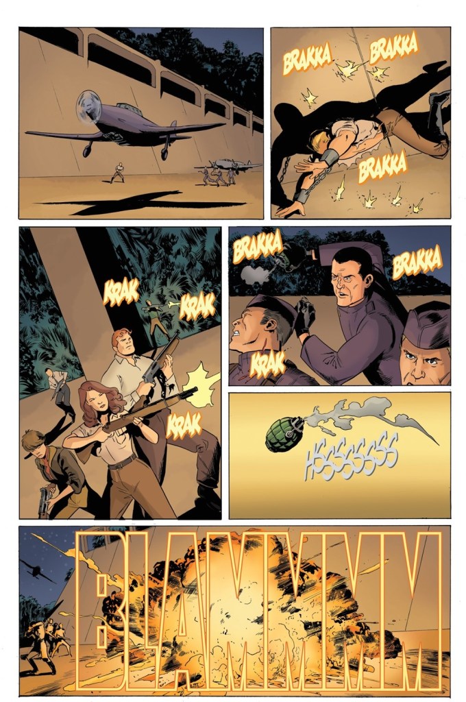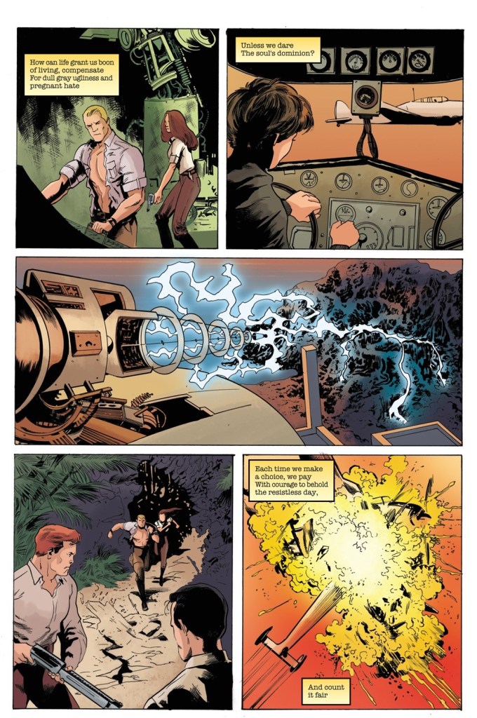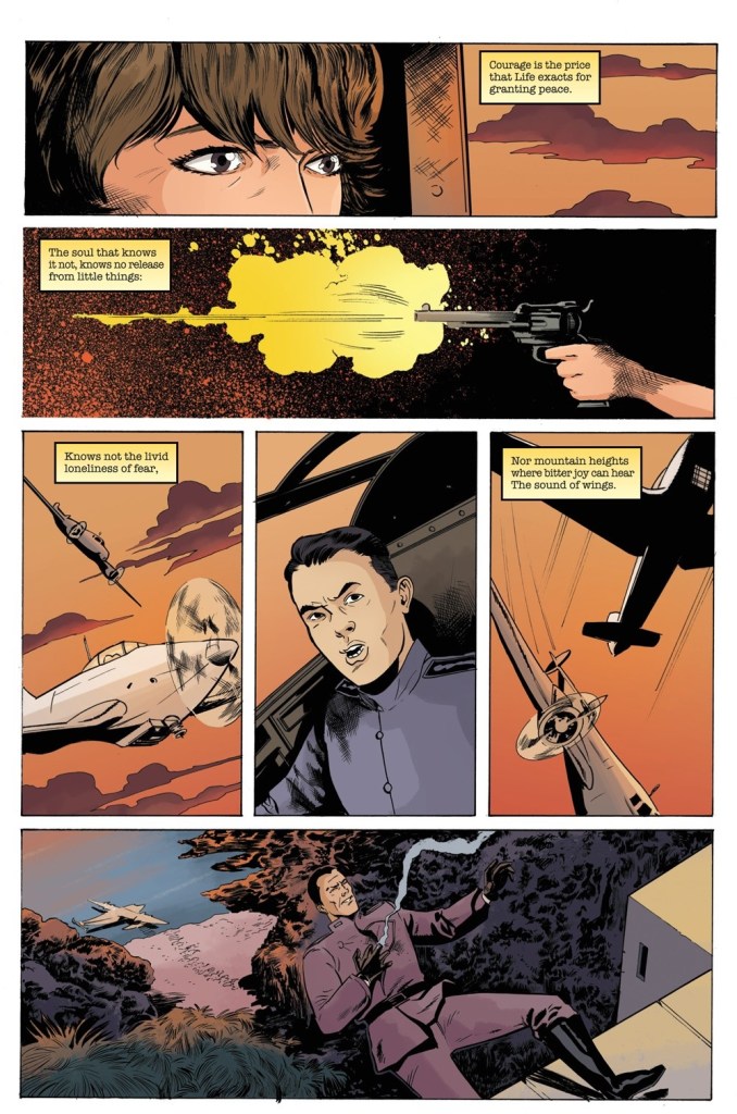 The final scenes are skillfully intercut for a powerful emotional conclusion. Instead of dialogue, author David Avallone — with remarkable artistry for a pulp/comic book story, orchestrates the scenes accompanied with captions that present Amelia Earhart’s poem, “Courage”.