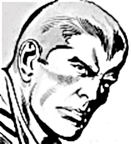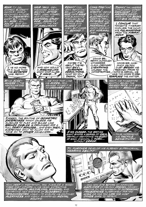 Doc is also introduced here, and in a subtle way (in the midst of his two-hour daily exercise routine). He is more Bama-inspired than styled after the Baumhofer pulp Doc…nor does he resemble the Ron Ely Doc from the film. Though the series will mostly see him in attire resembling that of the Bantam pulp covers, he will also sometimes appear in clothing suitable for the climate where the adventure takes place, and on occasion in a “normal” outfit suitable for the day.