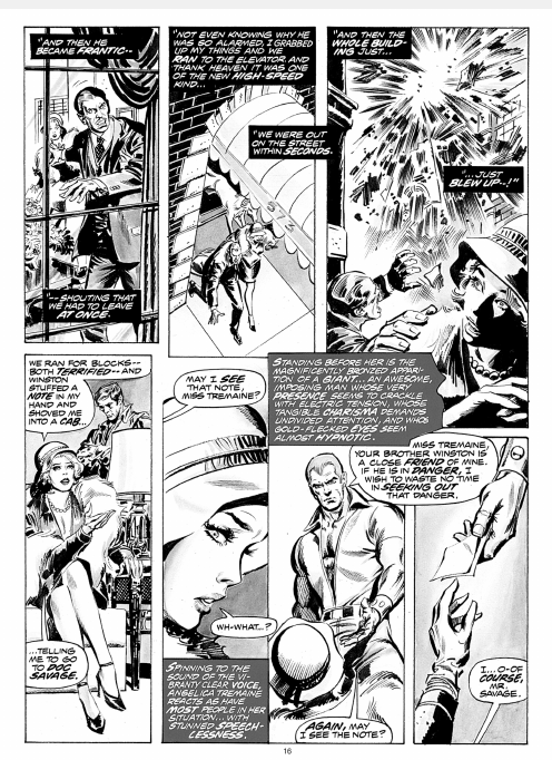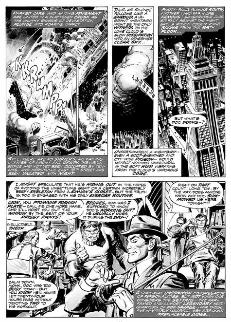 Instead of adaptations, the stories in the ’75 magazine were all originals. They could be structured and paced to put a single strong story into every issue. The first story in the series, written by Doug Moench, with art by John Buscema and Tony DeZuniga, tapped right into the zeitgeist of the 1930’s Doc with it’s explosive opening page.