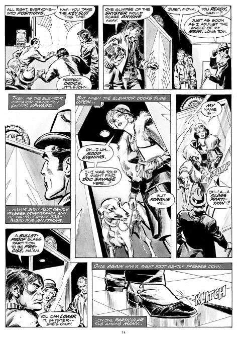 In the pages to follow, the scene deftly shifts between interplay between the aides, the arrival of the woman who heralds the adventure to come, and Doc exercising, while listening on the office intercom.