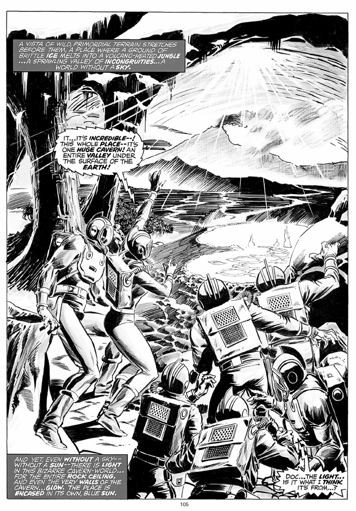 The discovery of lost worlds was a staple of the 1930’s adventure pulps, and even by the 1970’s when this story was written, the finding of secret worlds and lost civilizations was a thrilling moment. The “strange blue world” that Doc and the others now enter was a pretty enthralling sight.