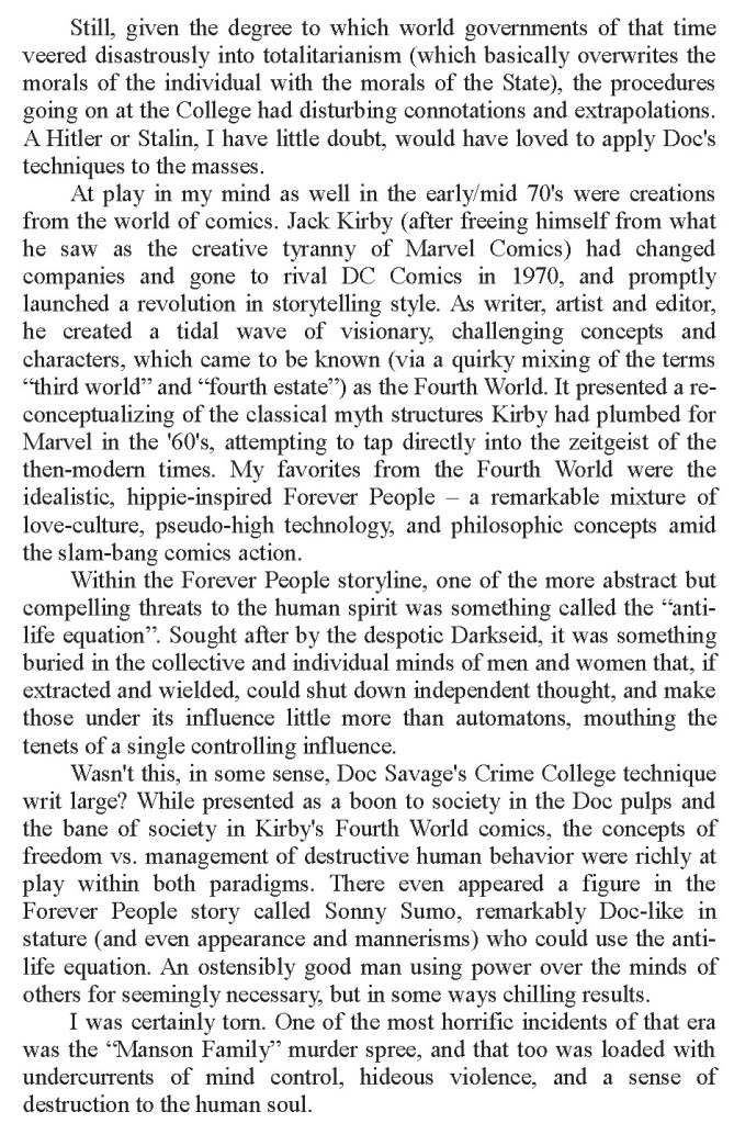 I was about 11 when I started reading Doc, with no knowledge of the ills of society. I didn’t give the College any deeper thought than I did Doc’s training or his Fortress of Solitude. He will always be seen in the golden glow of childhood by me. So I can’t look back and see say that he was wrong: I take him at his word and he does not do wrong. he makes mistakes but he never knowingly does wrong. But you’re doing your version of him, and anything goes. Good luck with the book.
