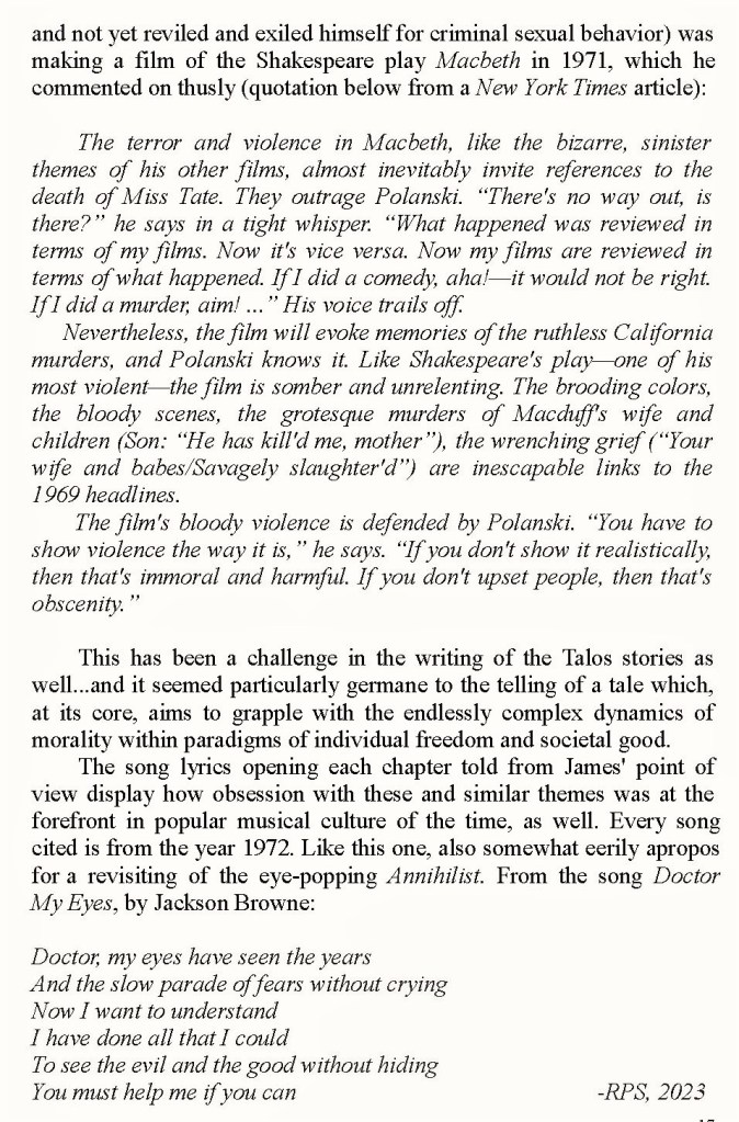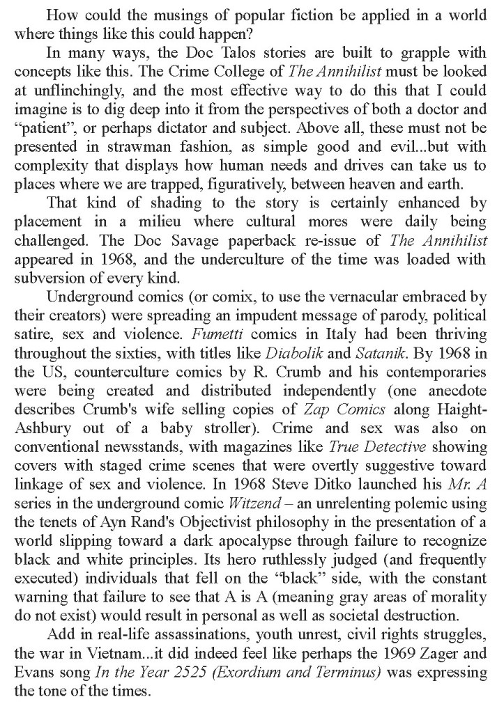 Upcoming in June of 2023 is the Doc Talos book “Annihilation”, which on the surface is a re-imagining of the classic Doc Savage pulp novel “The Annihilist”…but in actuality takes the basic premise of the original into a far more challenging cultural landscape. Set not in the 1930’s but in the period from 1968-1972, it dives deep into the cultural zeitgeist of that time, using the focal point of the Doc Savage “crime college” to explore the nature of criminal insanity (both of individuals and of society as a whole).