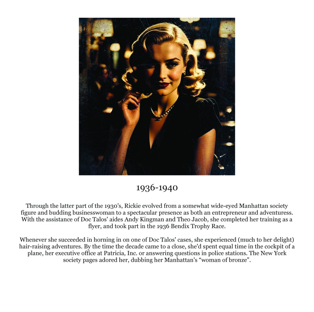 This book of collected Rickie Talos (pastiche of the pulp character Pat Savage) art is now available in both hardcover and PDF. In the form of a “photo album”, it presents scenes from Rickie’s life from a period that parallels the heyday of the pulps, beginning in 1930 with her as a teenager in Canada…