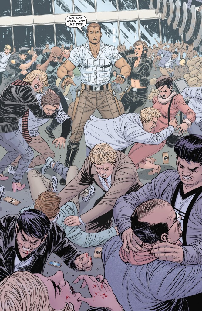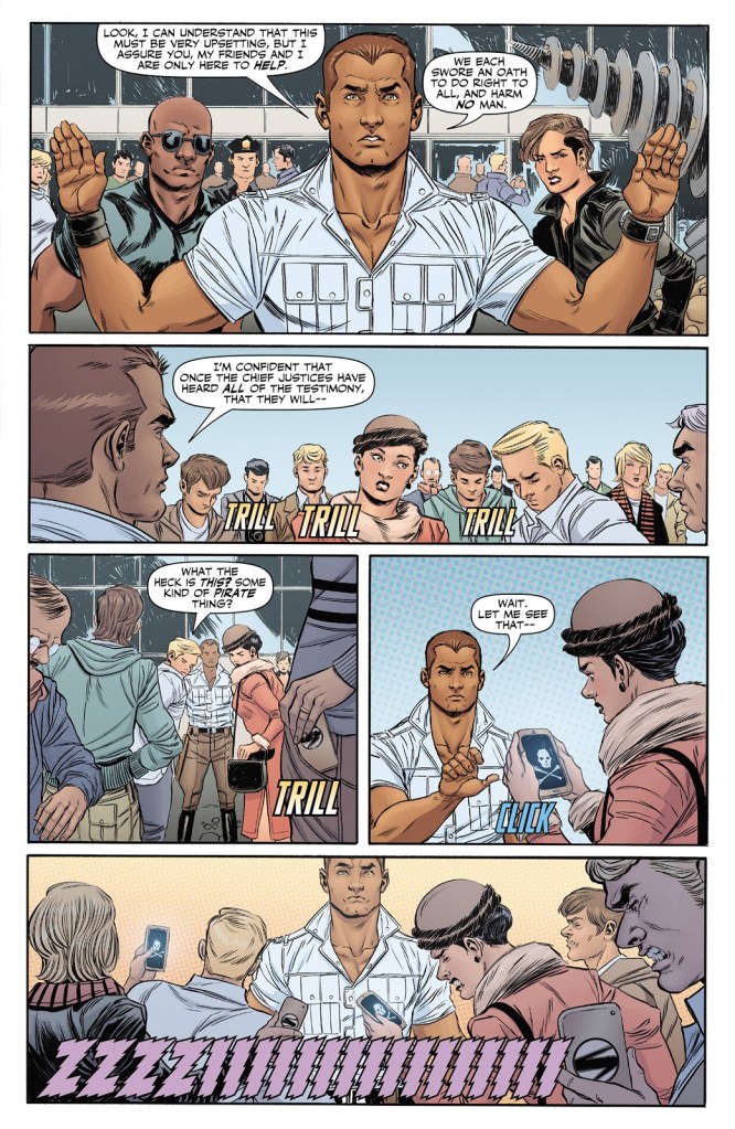 Visual design has always been a significant part of the Doc Savage mystique, and modern creators have stood on the shoulders of images by talents like Walter Baumhofer (pulp cover artist) and James Bama (paperback cover artist) for decades. But Jeff’s Doc Brazen #1: Millennium Bug took an innovative approach, tapping into the zeitgeist of 21st century symbolism, which uses simple, clean imagery and bold colors to carry its message.