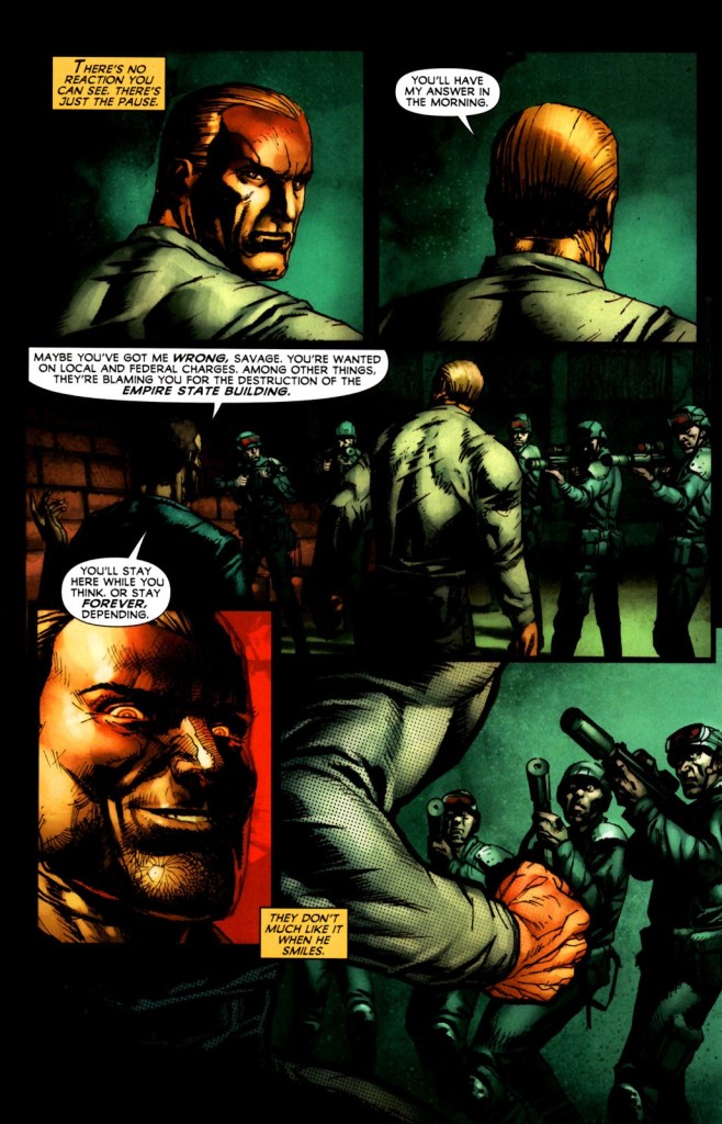 Of course there was no continuity between the story presentations of each company, so things with Dynamite went essentially back to square one. DC had utilized a reboot technique to transplant Doc into the time frame of 2010, but Dynamite took a different approach, beginning in the 1930’s and then moving forward through the decades. Doc’s survival across that arc of time was explained by his use of “silphium”, a plant introduced in the original pulp novel Fear Cay, which could be refined and ingested to produce human longevity.