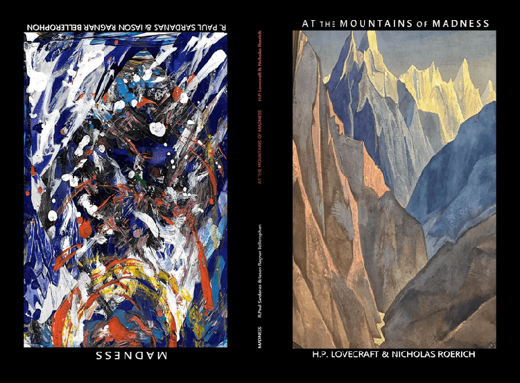 MADNESS/AT THE MOUNTAINS OF MADNESS by R. Paul Sardanas and Iason Ragnar Bellerophon, with classic original story by H.P. Lovecraft, illustrated with paintings by Nicholas Roerich. 164 pages, paperback. Book dimensions: 6 x 9.